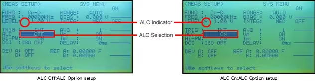 下圖展示了ALC on和off之間的差異。當ALC功能off時,電容器上的實際電壓約為1.0Vrms設定電壓的10%。當ALC功能on時,電容器上的電壓幾乎是設定電壓的100%。HP4284A具有電壓和電流等級監(jiān)視器,但還是可以使用伏特計驗證實際電壓。