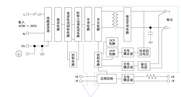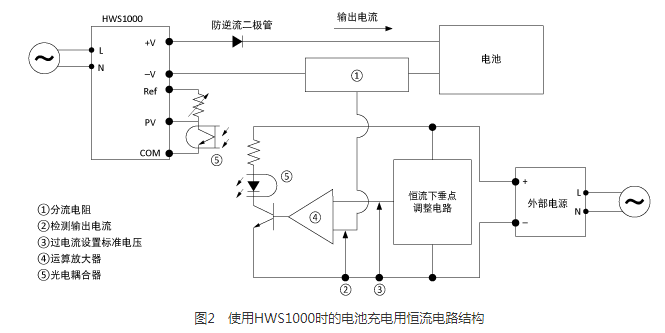 另一種控制恒流的方法是將外部電路連接到電源上,而不是像前面解釋的那樣通過過流保護轉(zhuǎn)移電流。以TDK的HWS1000為例來解釋這個過程:并聯(lián)電阻應用在電源的負載線上,輸出電流的電壓轉(zhuǎn)換是通過并聯(lián)電阻實現(xiàn)的,并進行輸出電流檢測。設(shè)計了恒流下垂點的調(diào)節(jié)電路,并建立了過流的標準電壓。在運算放大器中比較(2)和(3)的電壓,在光耦合器中控制電源的輸出電壓。