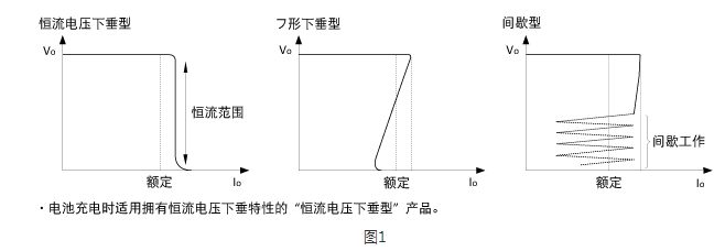 圖1中有三個主電源的過流保護特性。其中,適合電池充電的方式是擁有恒流電壓下垂特性的電源。通過運用其恒流范圍,可以對電池進行恒流充電。另外兩個特性不適合對電池充電,所以在選擇電源時要注意。